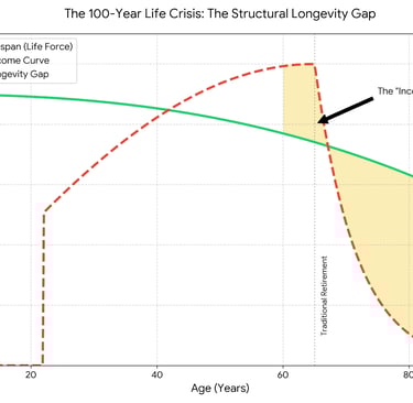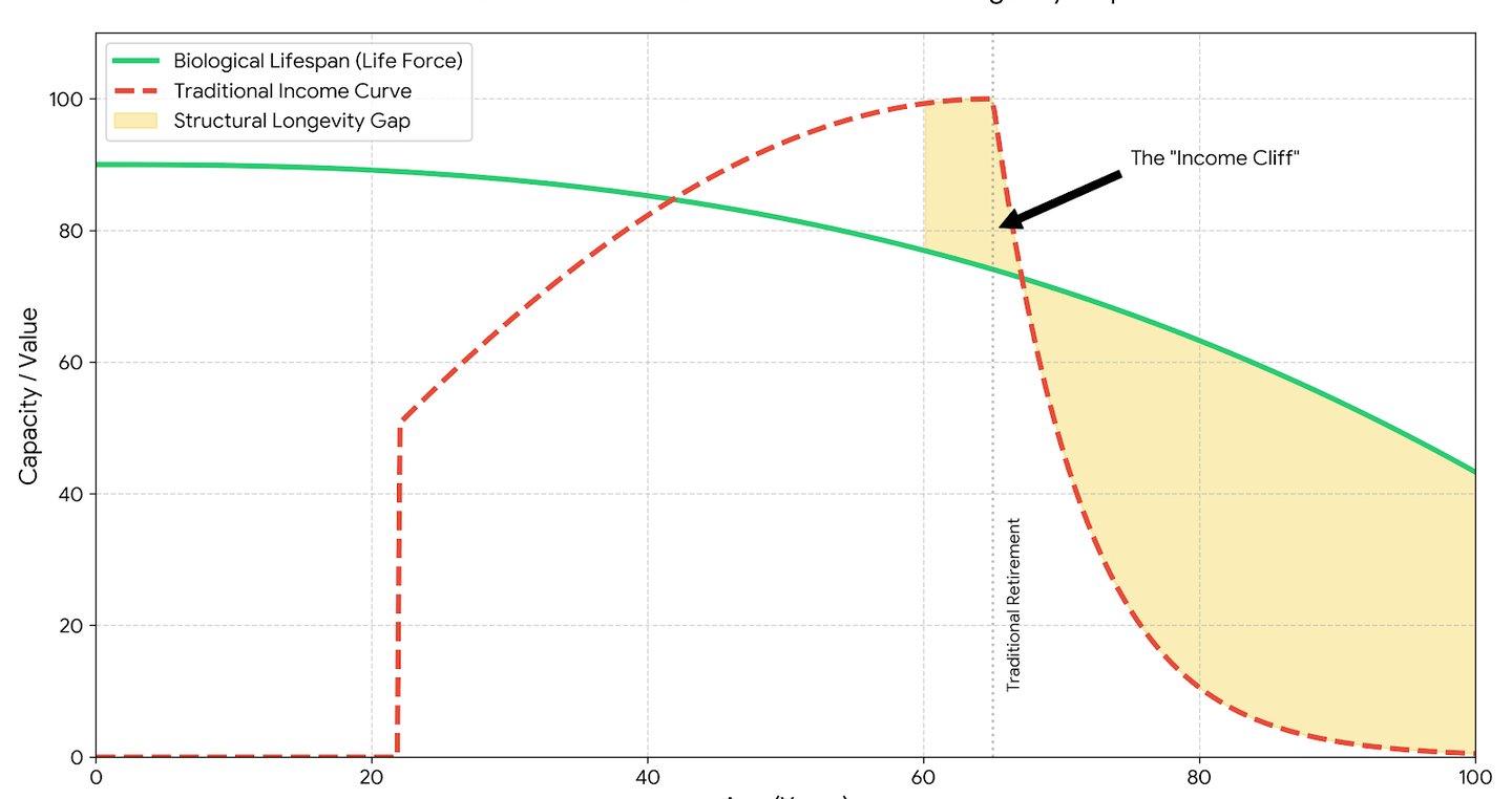 As shown above, if you continue using the Industrial Age map of "Learn-Work-Retire," you will fall into a massive golden abyss after age 60. That zone is not a "peaceful retirement" but a "vacuum of consciousness and value."