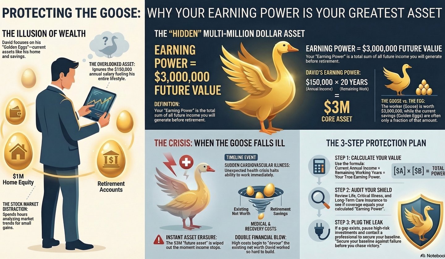 One day, an unexpected severe cardiovascular illness shatters his routine. Not only does David's income completely stop—instantly wiping out this $3 million "future asset"—but the exorbitant medical and recovery costs begin to rapidly devour his hard-earned "Net Worth." David spent all his energy trying to grow the golden eggs, but forgot to spend even a fraction of that to protect the goose.